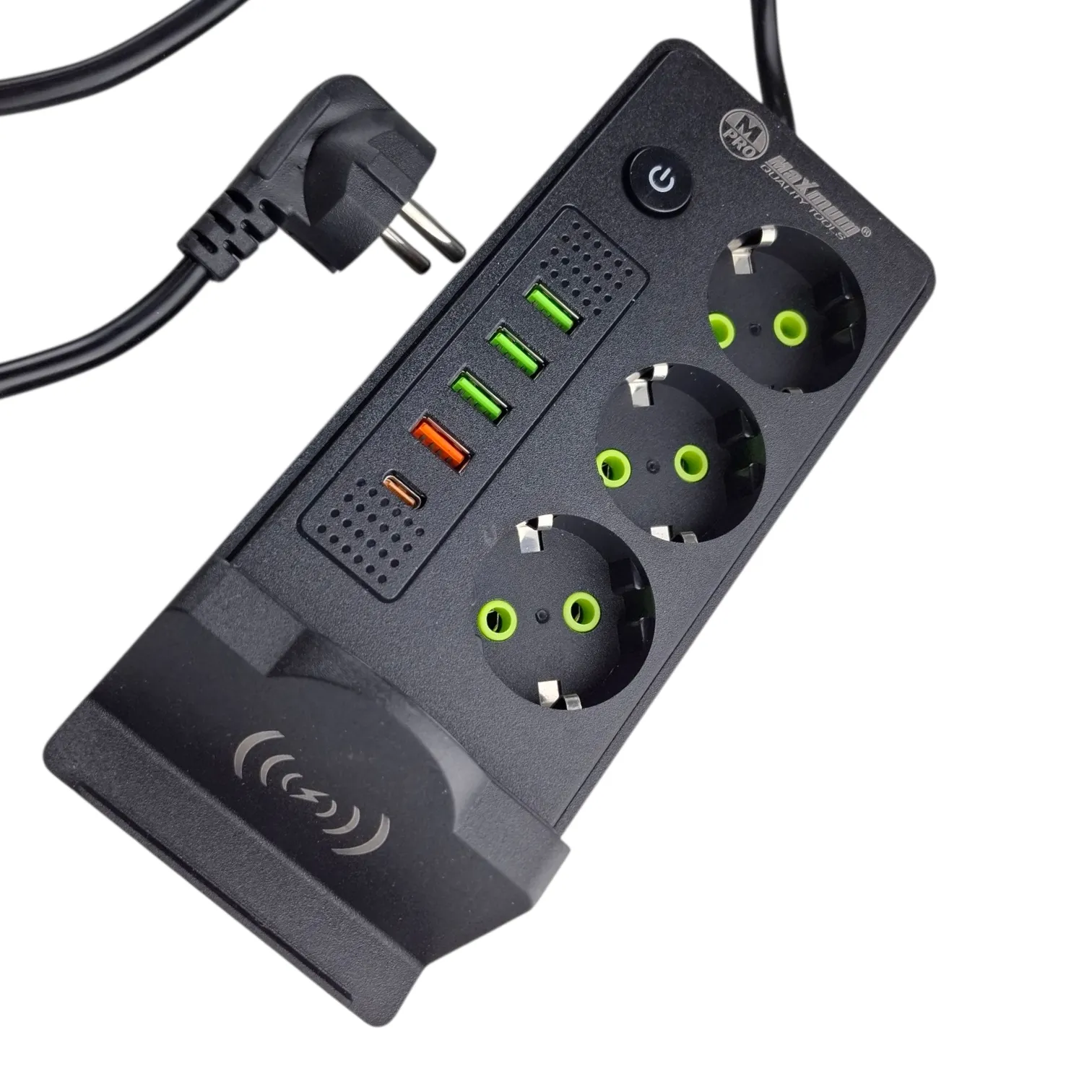 Фильтр сетевой 5 метров с беспроводной зарядкой от "Maximum Quality Tools" - это отличный выбор для тех, кто хочет обеспечить безопасную работу своих электронных устройств. Черный сетевой фильтр оборудован современной беспроводной зарядкой, 3-мя Евро розетками, 4-мя USB портами и 1-м разъемом Type-C, что позволяет быстро и легко заряжать свои устройства без необходимости использовать провода. Удлинитель имеет входное напряжение 220 В и номинальный ток 16 А.