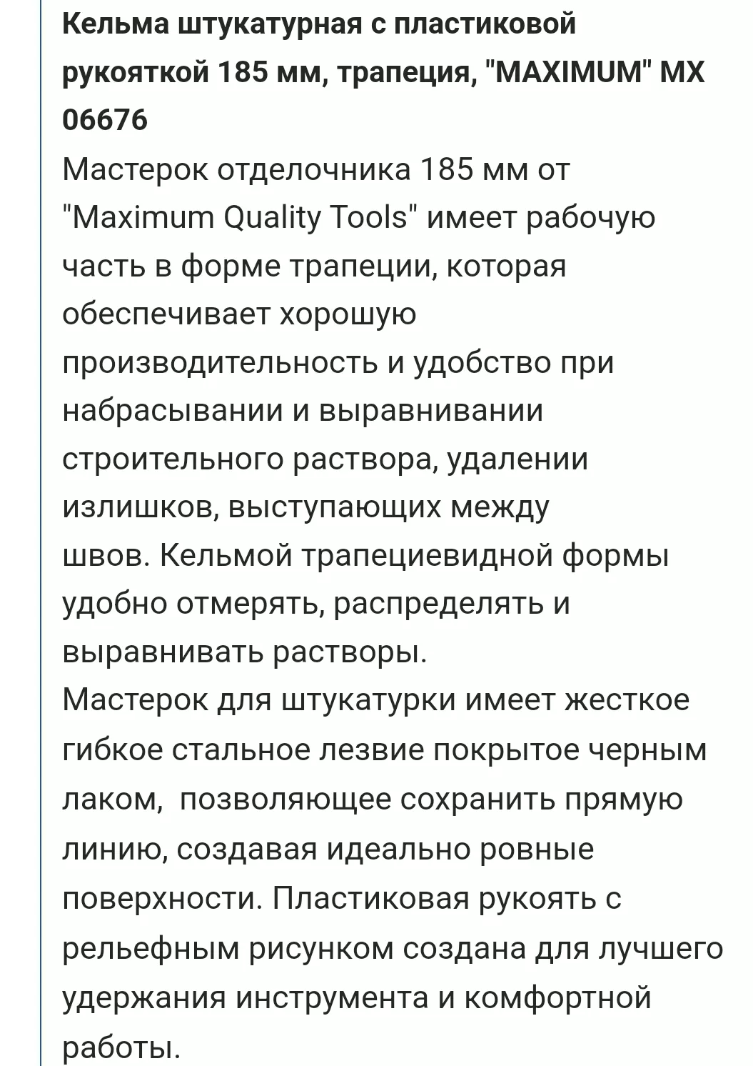 Мастерок отделочника 185 мм от "Maximum Quality Tools" имеет рабочую часть в форме трапеции, которая обеспечивает хорошую производительность и удобство при набрасывании и выравнивании строительного раствора, удалении излишков, выступающих между швов. Кельмой трапециевидной формы удобно отмерять, распределять и выравнивать растворы.
