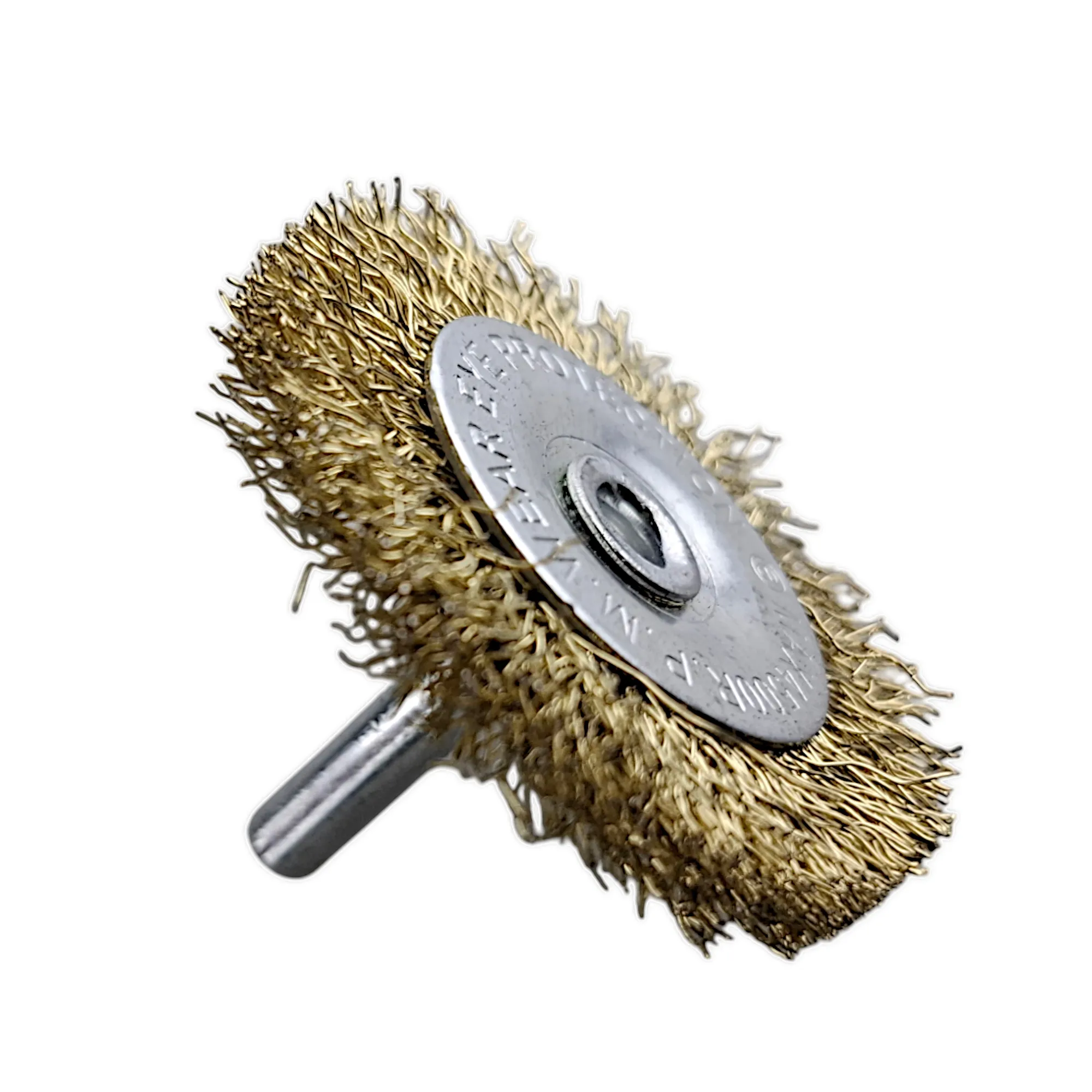Плоская щетка с проволочной щетиной из латуни 50 мм от "MAXIMUM QUALITY TOOLS" крепится на дрель или шуруповерт через резьбовую шпильку.